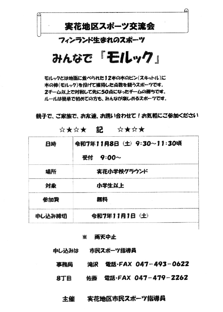 | 11月8日 9:00〜 | モルック交流会・実花小学校校庭 |